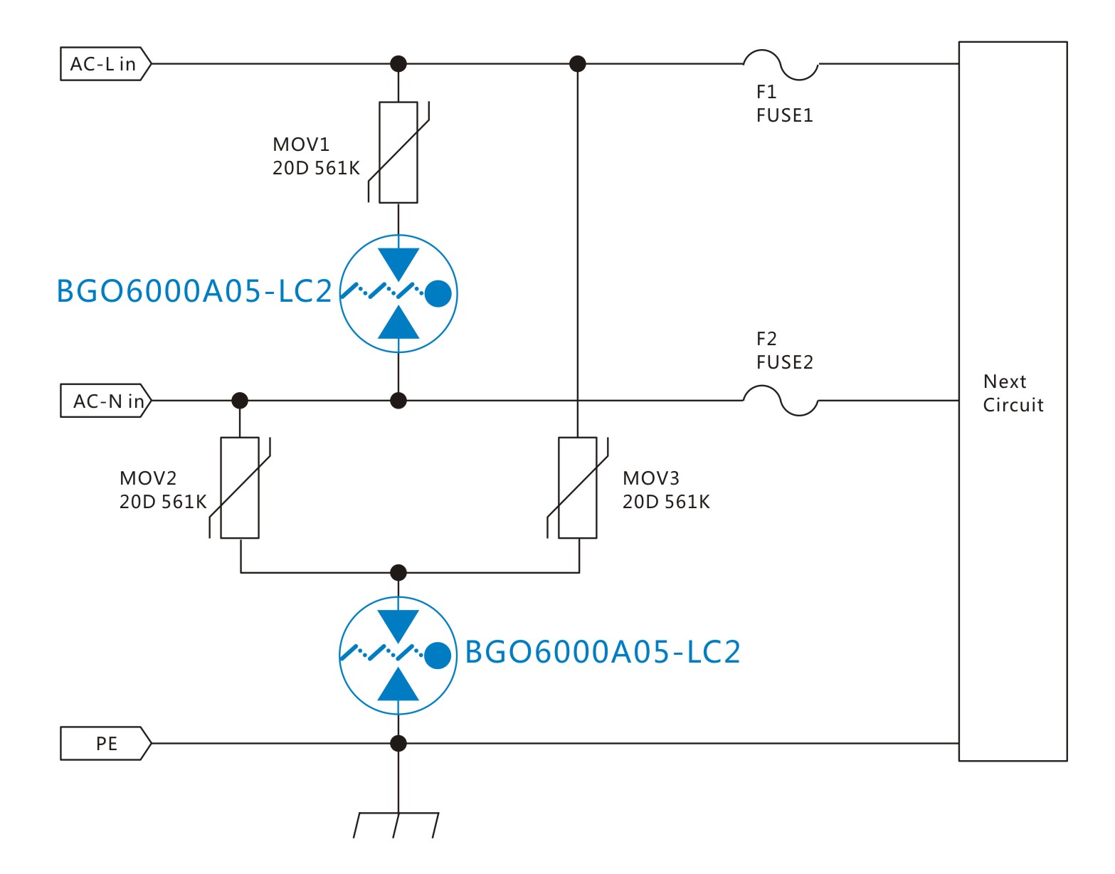 AC交流電源口通用三加一解決方案和T-MOV方案還是有導(dǎo)致起火燃燒的盲區(qū)存在,開(kāi)路失效氣體放電管正好解決了這個(gè)盲區(qū),推薦使用在共模或差模之間串聯(lián)壓敏電阻使用。