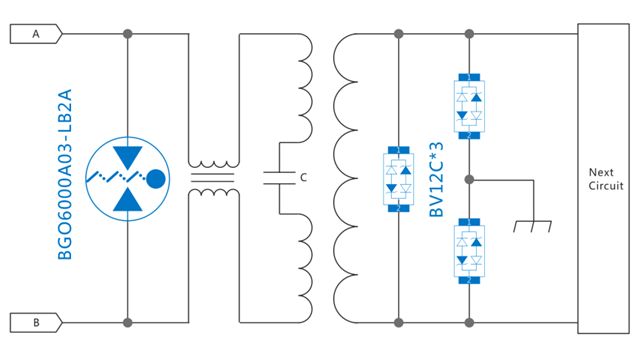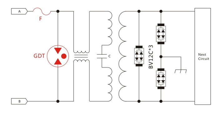 下圖為電源口典型的三加一電路,三顆壓敏加一顆氣體放電管: