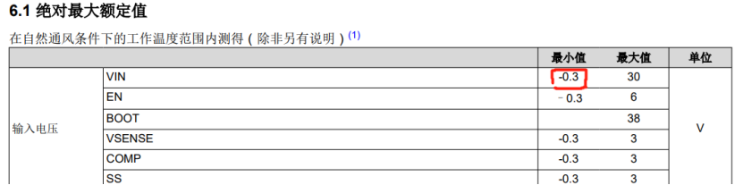 在充電IC手冊中,相信大多數(shù)伙伴都有留意到,有幾項極限參數(shù),其中有一項,VIN最小電壓值,一般只有-0.3V左右,如下表。